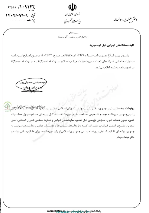 اصلاح تحریری تصویبنامه موضوع الحاق یک تبصره به ماده ۴ آیین نامه مسئولیت اجتماعی شرکت های تحت مدیریت دولت ابلاغ شد.