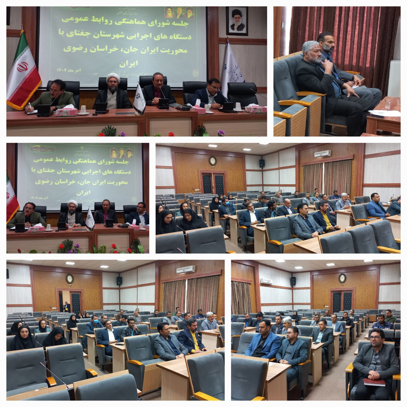 جلسه شورای هماهنگی روابطعمومی دستگاههای اجرایی شهرستان جغتای با محوریت تولید برنامه ملی «ایرانجان، خراسان رضویِ ایران» برگزار شد. در این نشست که با حضور فرماندار جغتای، امام جمعه، معاون سیاسی فرمانداری، بخشداران و مدیران دستگاهها تشکیل شد، بر نقش روابط عمومی در معرفی ظرفیتهای توسعهای شهرستان تأکید شد.
