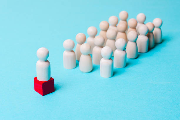 Wooden figures on a blue background. Leader and team. Business structure Management inside the organization.