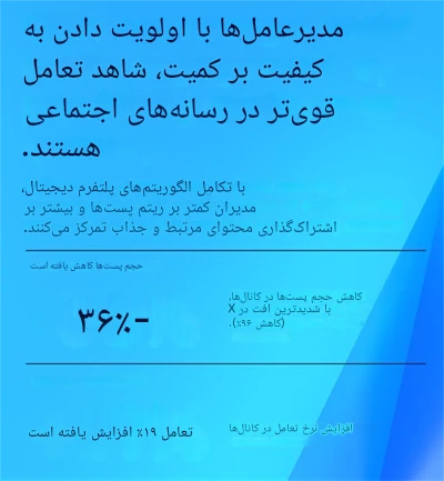 در مقایسه با سال قبل، تعداد مدیرانی که حداقل ماهی یک‌بار محتوا منتشر می‌کنند رشد قابل توجهی داشته است. با این حال، گزارش تأکید می‌کند که افزایش تعداد پست‌ها لزوماً به معنای اثربخشی بیشتر نیست. در واقع، اگرچه حجم کلی محتوا کاهش یافته، اما میزان تعامل کاربران افزایش پیدا کرده است؛ نشانه‌ای روشن از اینکه کیفیت محتوا بر کمیت آن برتری دارد.