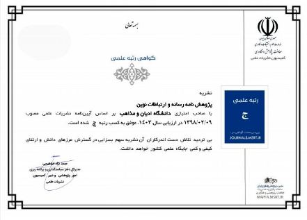 شبکه اطلاعرسانی روابطعمومی ایران (شارا) || دوفصلنامه پژوهشنامه رسانه و ارتباطات نوین دانشگاه ادیان و مذاهب، بر اساس آئیننامه نشریات علمی مصوب ۱۳۹۸/۰۲/۰۹، در ارزیابی سال ۱۴۰۳ موفق به کسب رتبه علمی ج شده است.