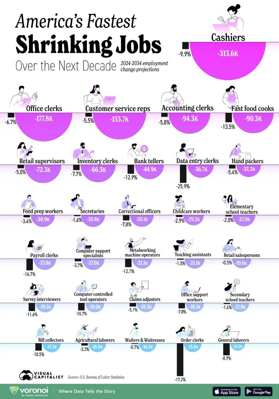 شبکه اطلاعرسانی روابطعمومی ایران (شارا) || مطابق پیشبینیهای اداره آمار کار آمریکا (BLS)، برخی مشاغل در دهه آینده با کاهش قابل توجه مواجه خواهند شد.